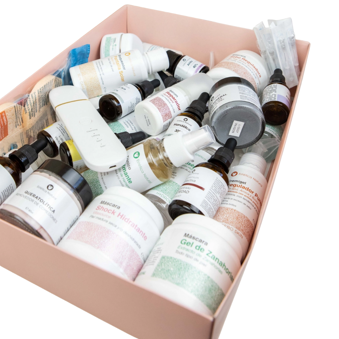 Contenido de la caja profesional facial: Leche de limpieza Aloe y vitamina A, Gel espumoso de limpieza Tea Tree, Emulsión Limpiadora AHAs, Emulsión Exfoliante, Tónico Antiséptico, Tónico Hidratante, Tónico Calmante, Máscara Gel de Zanahorias, Máscara Sebo Reguladora, Máscara Shock Hidratante, Fluido Hidratante de Palta, Emulsión Hidratante Suave, Emulsión Nutritiva Colageno y Elastina, Bloqueador Solar, Cremigel Regulador Pureza, Hydrovital contorno de ojos, Concentrado de Ácido Hialurónico, Extracto de Aloe Vera, Ácido Mandélico al 30%, Esponjas Faciales (x2), Agujas (x10), Gorros para tratamientos y una Espátula Ultrasónica de regalo.