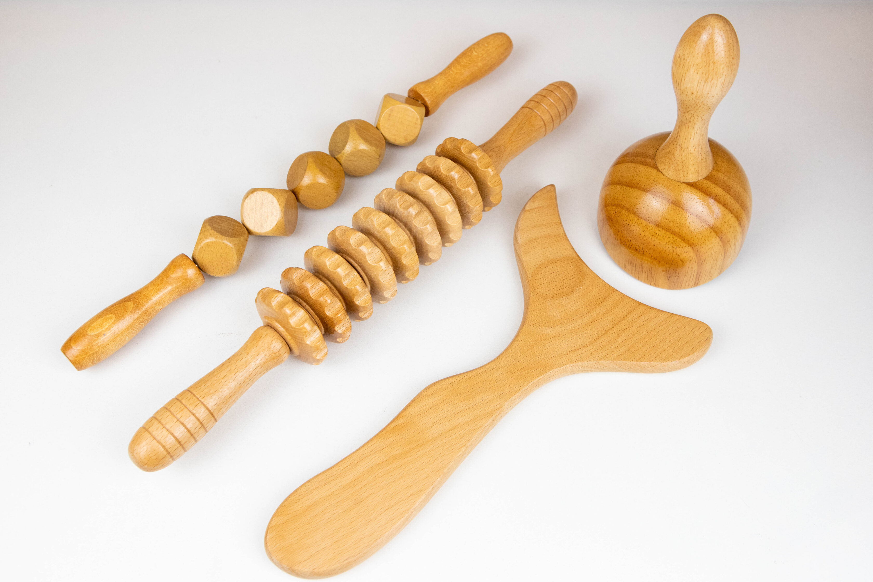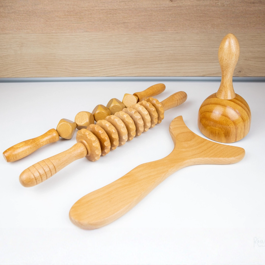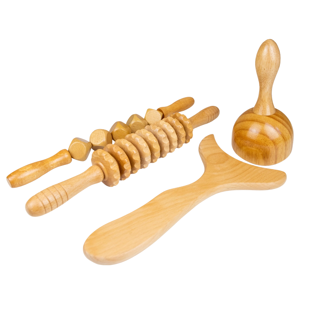 Kit esencial de maderoterapia con herramientas para un tratamiento completo: activa, moldea, drena y reduce la celulitis para esculpir y tonificar la figura.