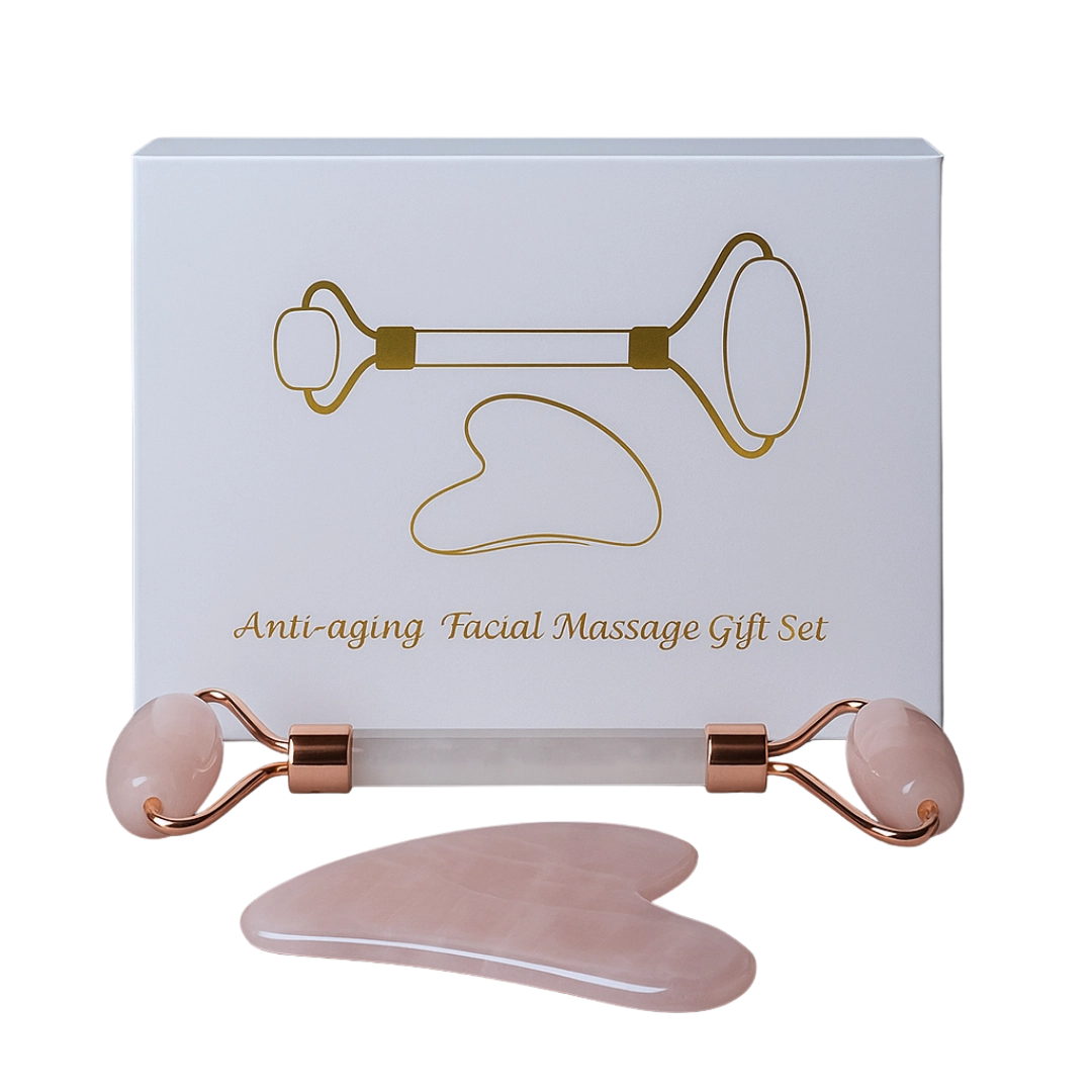 Este Kit Gua Sha y Rodillo de Cuarzo Rosa combina dos herramientas esenciales para un tratamiento facial completo y natural.
