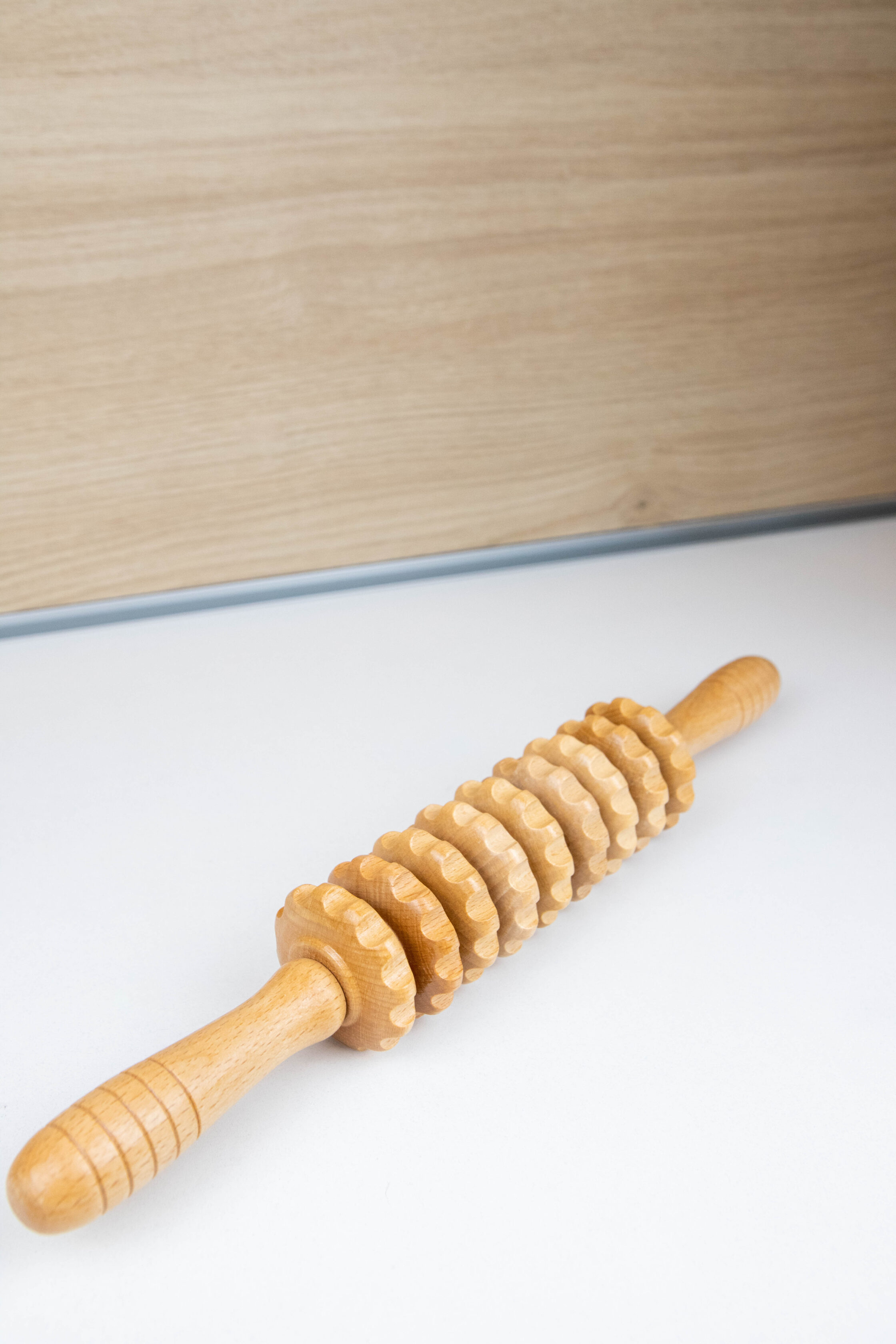 El rodillo estriado móvil es una herramienta versátil de maderoterapia diseñada para combinar beneficios terapéuticos y estéticos en un solo instrumento. Su forma ergonómica y su superficie texturizada, cuidadosamente trabajada, permiten un masaje profundo y preciso sobre diferentes zonas del cuerpo.